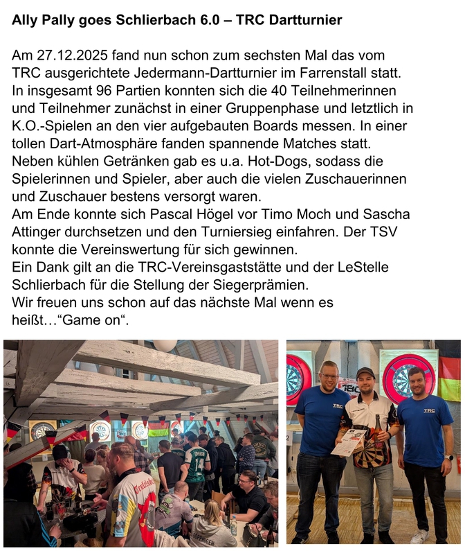 Am vergangenen Samstag, den 31.01., fand bereits zum 15. Mal das alljährliche Grün kohlessen des TRC Schlierbach im Farrenstall statt. Rund 50 Gäste durften wir an diesem Abend begrüßen und gemeinsam westfälischen Grünkohl genießen.
