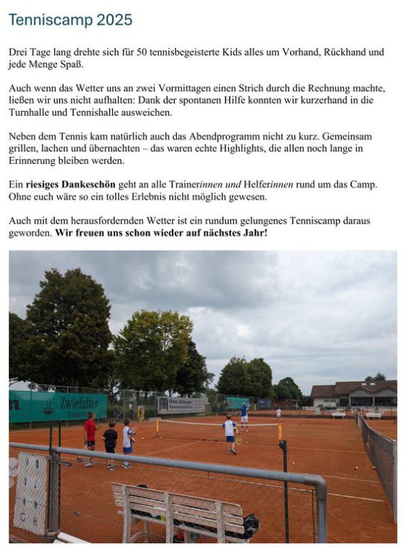 Abschließend möchten wir uns bei allen Helfern im Vorder- und Hintergrund herzlich bedanken. Dies schließt die Unterstützung der Herrenmannschaften ein, die Bäckerinnen und Bäcker, die Griller sowie die fleißigen Hände beim Auf- und Abbau des Camps. Ohne eure Hilfe wäre dieses Tenniscamp nicht möglich gewesen. Vielen Dank für euren unermüdlichen Einsatz und eure Unterstützung!
